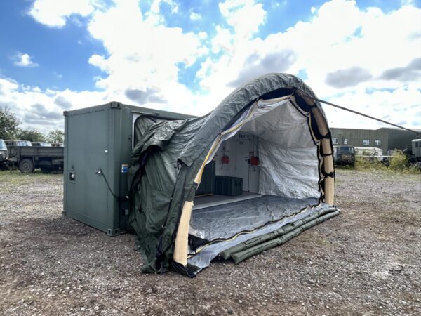 They feature lighting and power points with individual fuse boxes and power inputs. With double drop down side walls on inbuilt winches, the sidewalls have integrated air inflated link assemblies that can be infinitely interlinked with other structures to create a sterile work environment for a range of conditions, built with the ability to withstand extremes of temperature and weather.